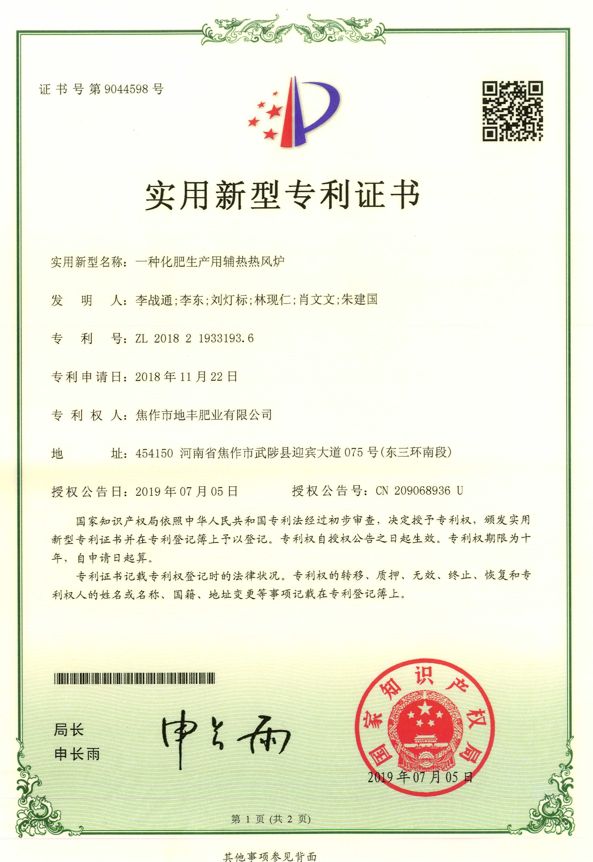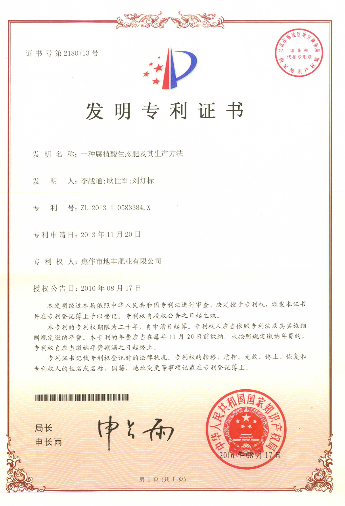 腐殖酸發(fā)明專利證書