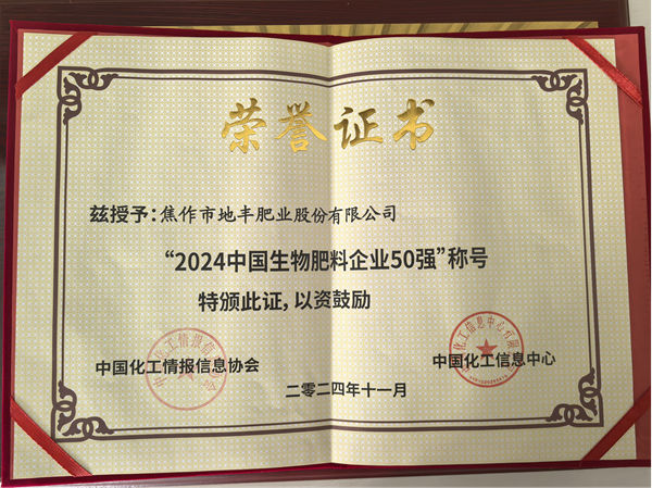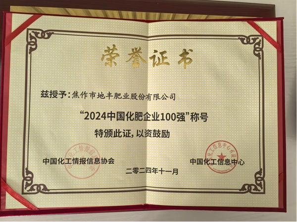 2024年11月29日,一條喜訊從鄭州傳來,在中國化肥企業(yè)100強(qiáng)評選活動暨中國化肥產(chǎn)業(yè)新質(zhì)生產(chǎn)力論壇上,焦作市地豐肥業(yè)股份有限公司再次榮獲“中國化肥企業(yè)